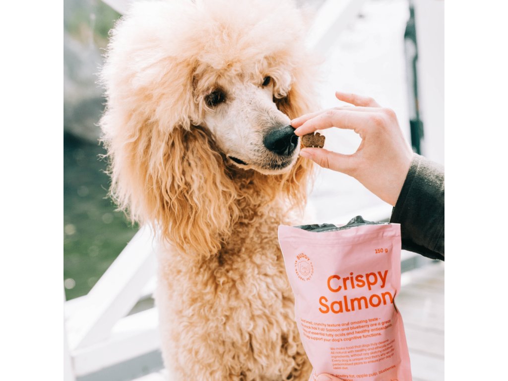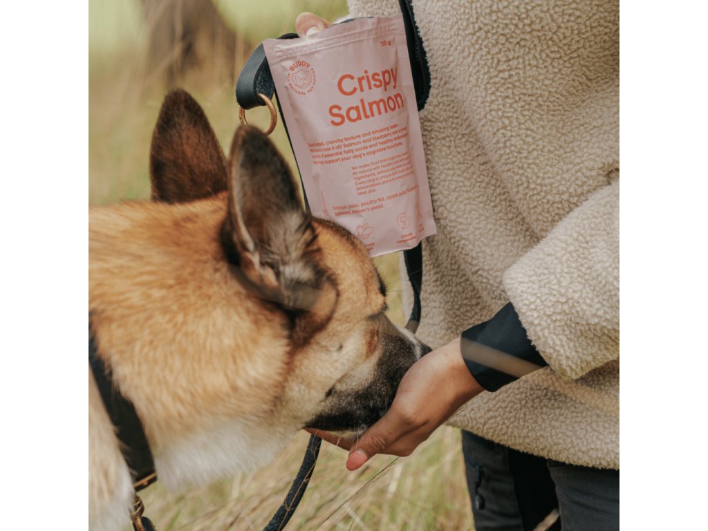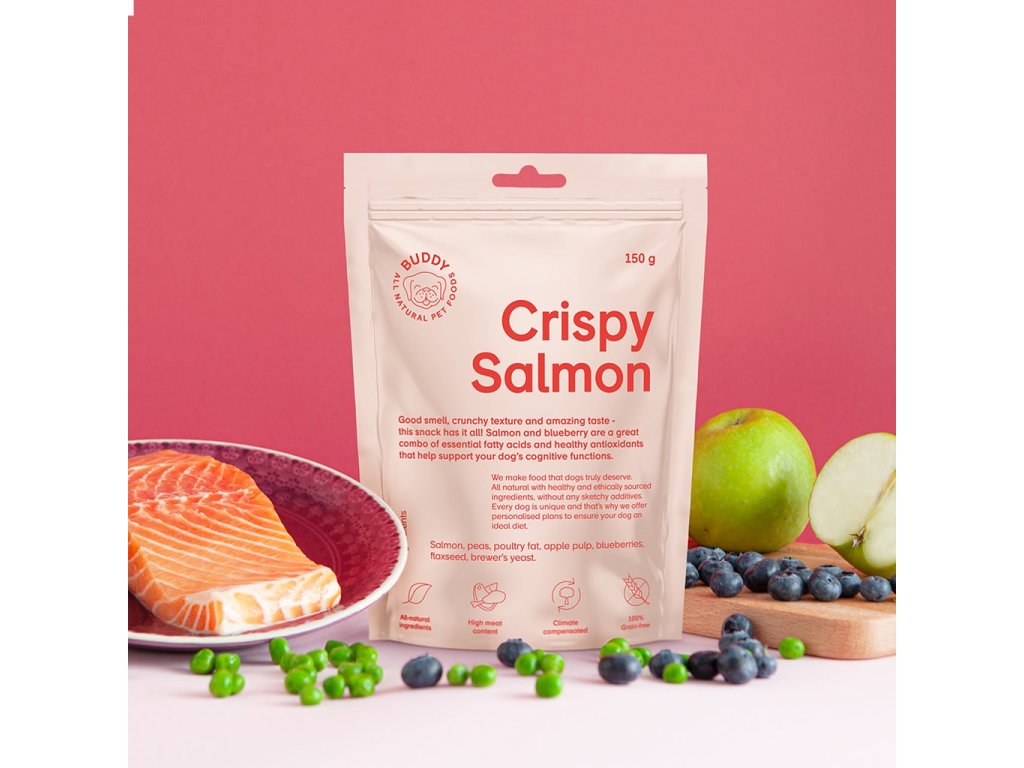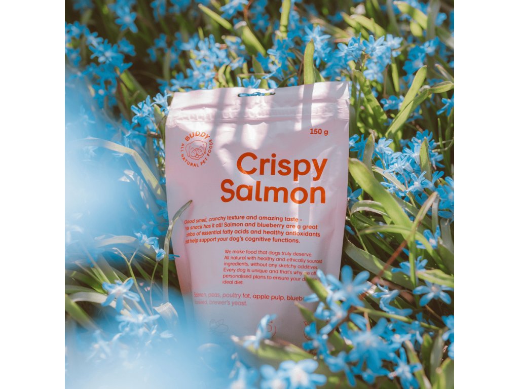 Chrumkavá a chutná psia maškrta vyrobená z čerstvého lososa a čučoriedok, bohatá na omega-tuky, bielkoviny a antioxidanty.