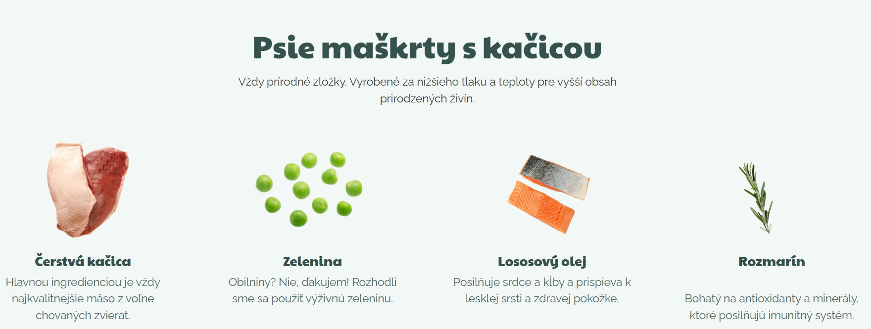 Kačacie mäso 30 %, žltý hrášok, tekutý rastlinný škrob, hydrolyzovaný kurací proteín, kolagén, omáčka z kuracích pečienok 5 %, sušený rozmarín 1 % a lososový olej.