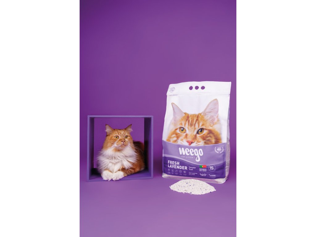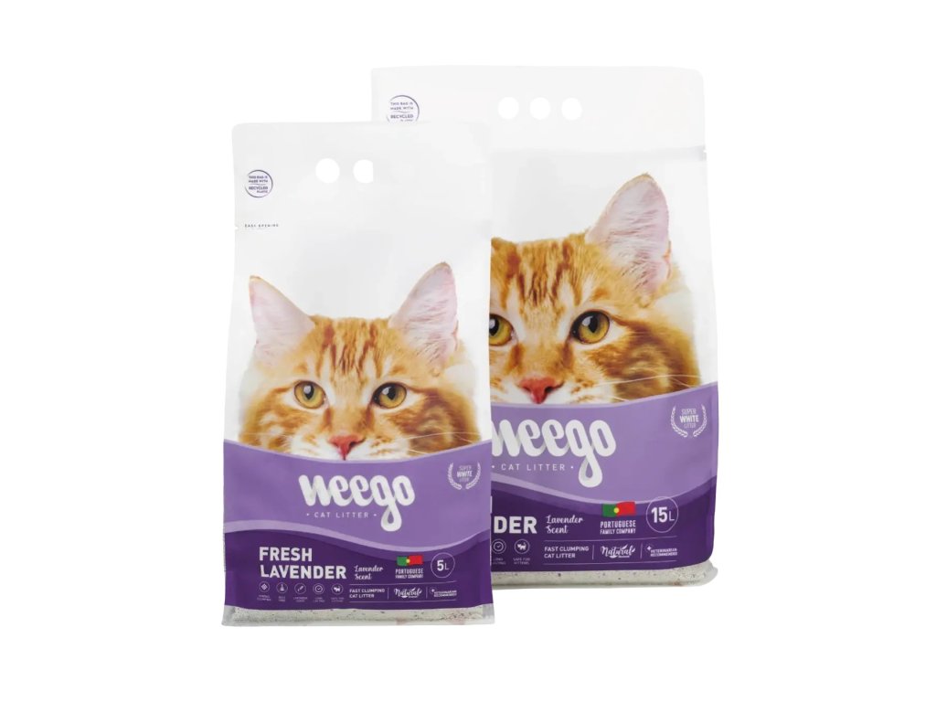 🌱 Prírodné: Vysokokvalitná hrudkujúca podstielka vyrobená z prírodného bentonitu s levanduľovou vôňou.